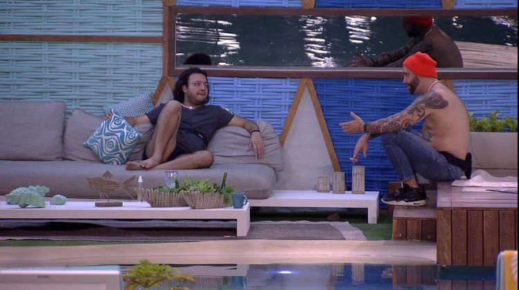Diego e Caruso trocam impressões sobre o jogo sentados no deck. "Por isso que eu falo, tem gente que se cair no Paredão, sai", opina o publicitário e Diego completa: "Tem que testar, mas agora a questão é se a gente vai ter poder de fogo para mandar alguém".
