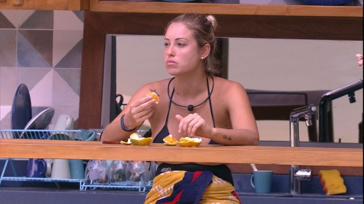 Jéssica conversa com Ayrton após curtir a piscina. A sister avisa que vai relaxar um pouco e desabafa: "Estou me concentrando, mas o aperto no coração está forte ainda".